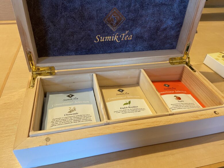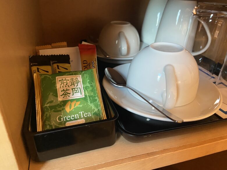 ミニバーには、ケトル・グラス・マグ。コーヒー・紅茶・緑茶などのティーバッグが2セットずつ置いてあります。