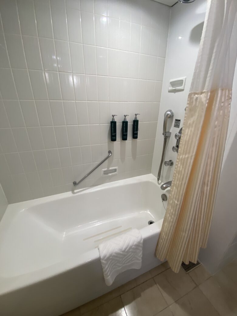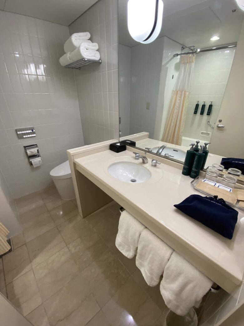 今回の客室では、ユニットバス式でした。浴槽と脱衣所・トイレにはシャワーカーテンで仕切られています。