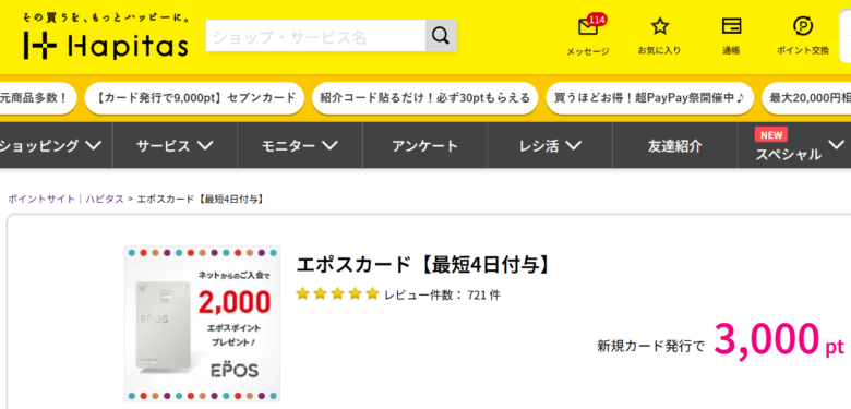 私の場合、ハピタス経由でクレジットカードを発行した時は、1件で3,000ポイント(≒3,000円)もらえました。