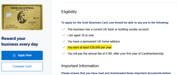 イギリスのアメックス・ビジネス・ゴールドでは、入会条件として年収2,000ポンドが定められており、日本円に換算すると約400万円相当に値します。