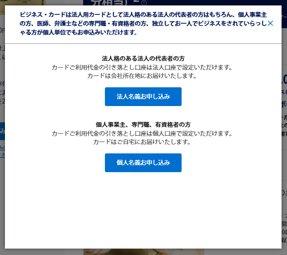 まず、アメックス・ビジネス・ゴールドの申し込みボタンをタップすると以下のポップアップが表示され、自身が該当する方を選択します。