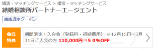 たとえば、結婚相談所のパートナーエージェントは入会の初期費用が50%オフ、つまり55,000円引きで入会できる内容です。