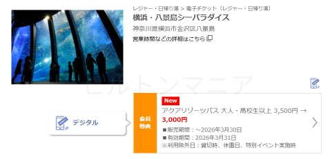 たとえば、横浜・八景島シーパラダイスの料金はASOVIEW!でも一般価格と大差がない大人3,500円/人です。