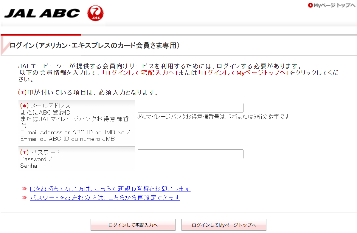 アメックス手荷物無料宅配サービスはJAL ABCが提供するサービスのため、オンライン予約の場合は、JAL ABCでアカウントの作成が必要です。