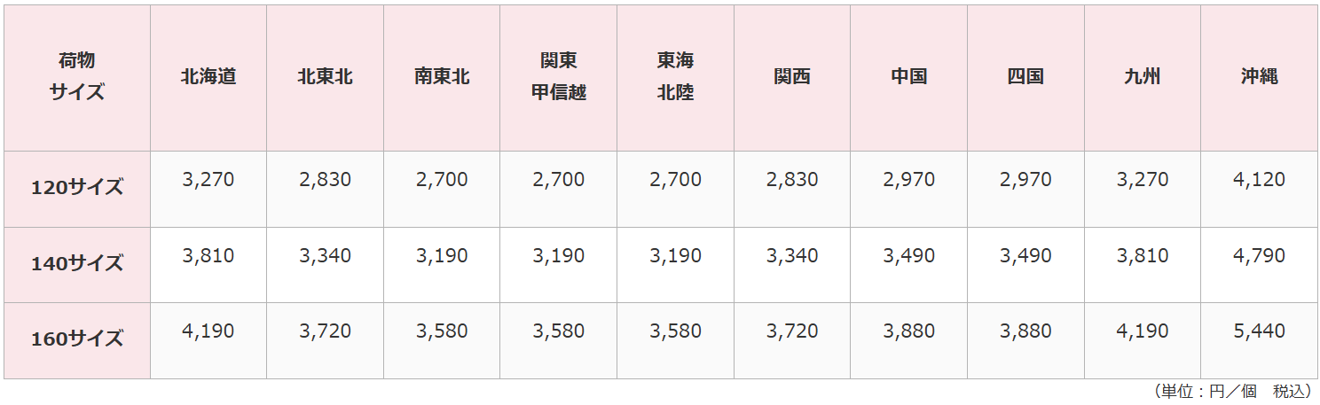 配送可能な荷物のサイズは、3辺(縦/横、高さ)の合計が160cm以内と定められています。
