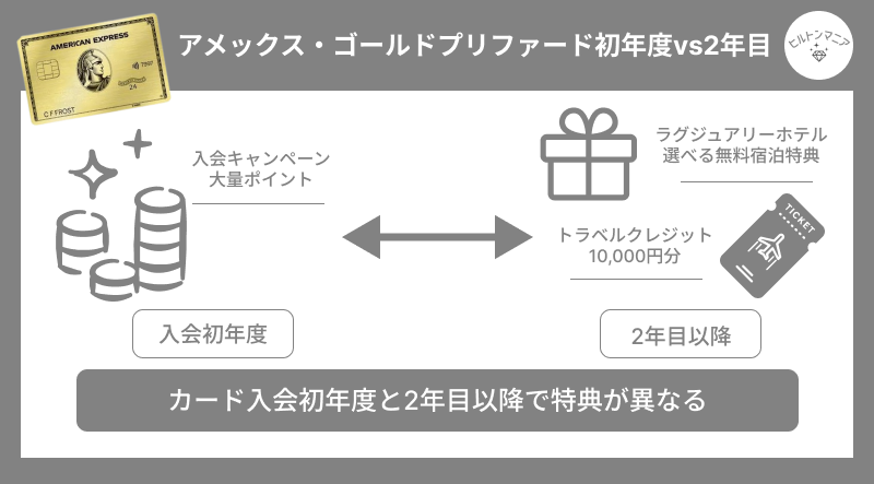 2年目が不利なわけではありません。初年度には付与されないラグジュアリーホテルへの無料宿泊特典や、アメックストラベルオンラインで使える10,000円分のトラベルクレジットが貰えるため、年会費に対してのリターンも大きいのです。