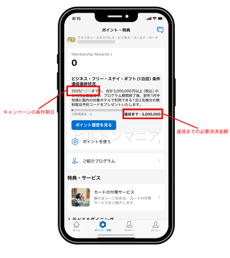 アメックスゴールドプリファード入会キャンペーンの達成状況の確認方法