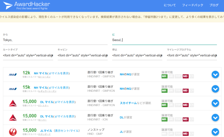 検索インターフェースが直感的で使いやすく、出発地と目的地を入力するだけで各プログラムで必要なマイル数や諸費用が一覧表示されます。