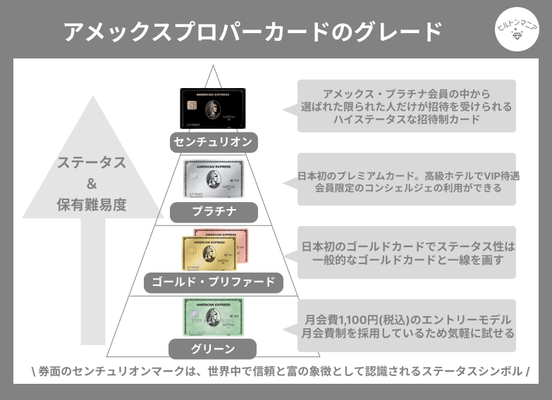 確かに、アメックスにはグレード(カードランク)が下図の通りあり、トップのセンチュリオンカードこそ自分で申込みが不可の資産家向けのカードは存在します。