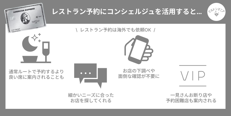 特にレストラン選びでは、予算や人数などの希望条件を伝えると複数の候補店舗をピックアップしてくれるだけではなく、予約では予約困難店を抑えてくれたり自身で予約するより良い席に案内されたりなど、時間の節約にもメリットがあるため利用者からは定評があります。