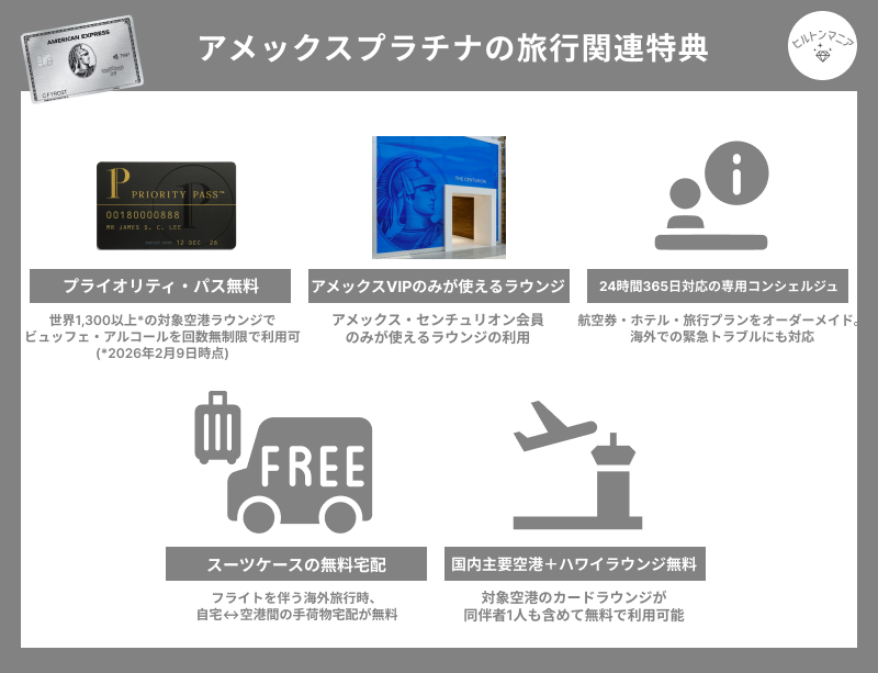 アメックス・プラチナの主要特典の多くは、旅行・ホテル・空港ラウンジに集中しています。