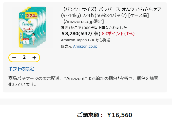 具体的には、我が家が買うパンパース。まとめて買って約15,000円。Amazonのポイントも同時にゲットしつつアメックスポイントも獲得。