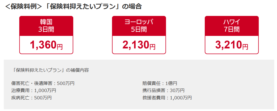 通常海外渡航前に傷害保険に加入すると、最安値のプランでも以下の保険料が必要です。