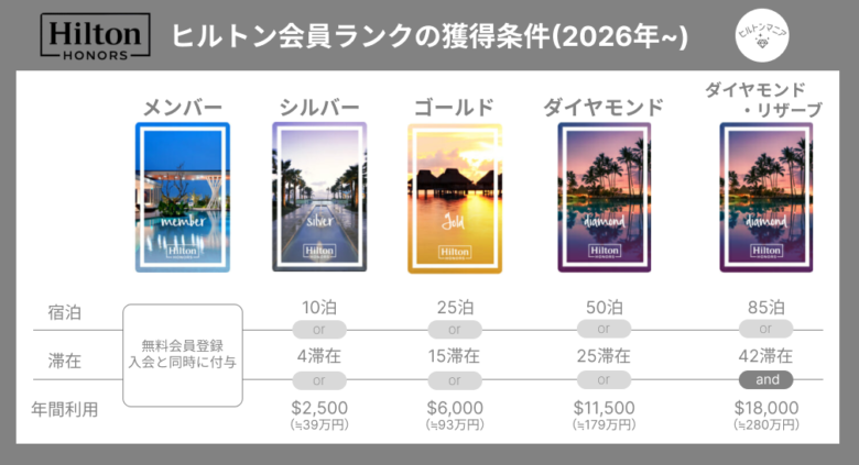 | ダイヤモンドリザーブ(2026年新設) | - | 85泊 / 42滞在 かつ年間利用$18,000 | 新設 |