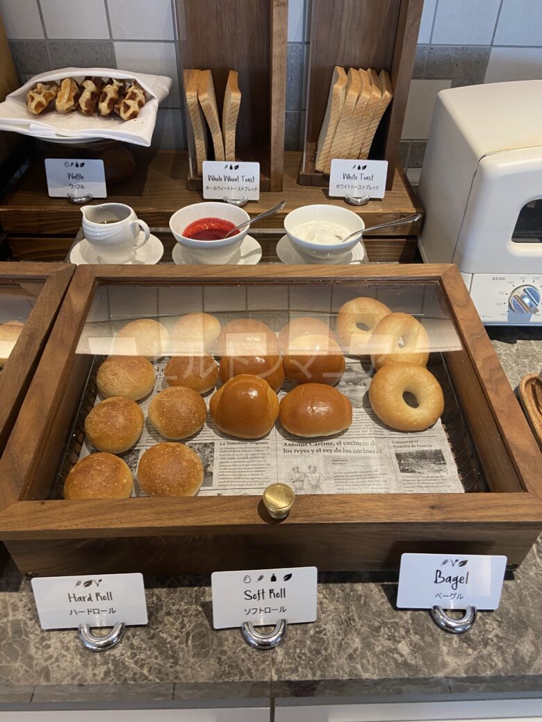 パンの種類は朝食会場より少ないものの、朝食会場にはないアラジンのトースターでパンを温めることができます。