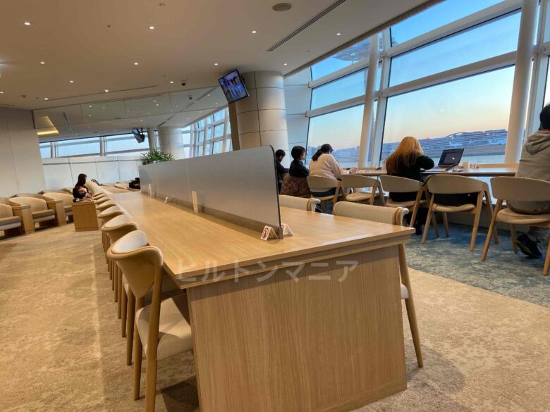 また、下図の羽田空港国際線ターミナルのラウンジでは、窓際に座れば飛行機の機体がたくさん並ぶ様子が一望できます。