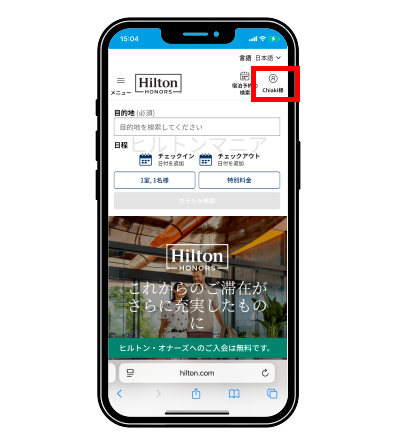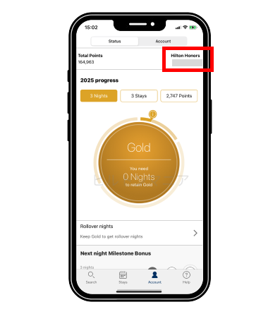 ログイン後、右下の「Account」をタップすると右上にヒルトンオナーズ番号が確認できます。