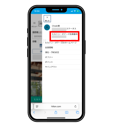 すると、下図のとおりヒルトンオナーズ会員番号が確認できます。