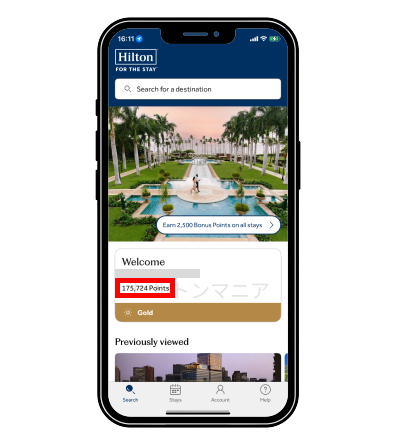 ヒルトン公式アプリの場合、下図の通りログインするとすぐに保有するポイント数を確認できます。