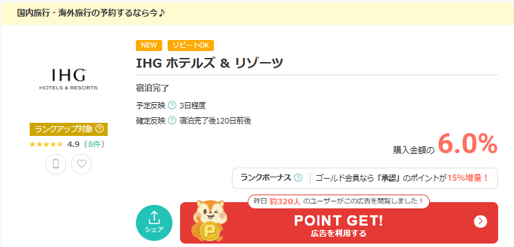 日本のポイントサイトではIHGの還元率が1~6%程度のところが多いので、TopCashbackとの差は最大10倍にもなります。